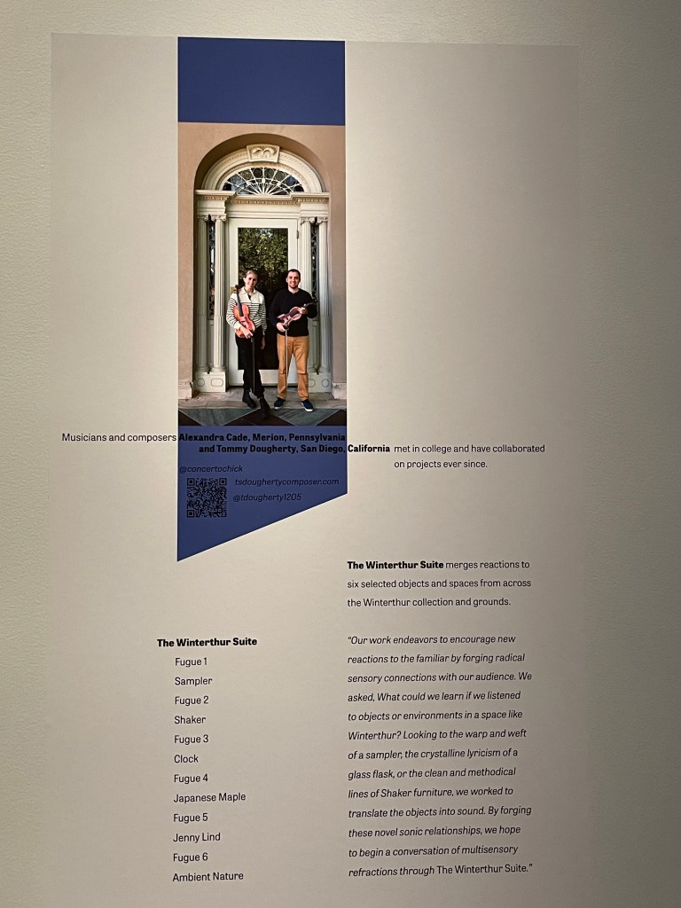 Employing comprehensive methodology to unpack craftsmanship, aesthetics, history, and use, objects can be understood in a multitude of ways. Their materiality speaks to deeper understandings of their human entanglements, which informs our present. However, these perceptions are often limited to what one can see and feel. Turning to the sounds surrounding an object, music can bring historical themes to the forefront and place them in immediate conversation with the object’s physical appearance. As a team comprised of a historian and composer, we are particularly interested in how the understanding of an object can be expanded through sound. In what ways can music inform about the human experience, and especially highlight the stories of marginalized communities, commoditization, and violence that are so often underneath the elegant exteriors of American decorative arts? This project, The Winterthur Suite, aims to fuse interpretations of the past and present to enrich the physical experience of objects and spaces, creating a new composition that can simultaneously stand alone and work in conversation to encounter familiar objects in unfamiliar ways – Alexandra Cade